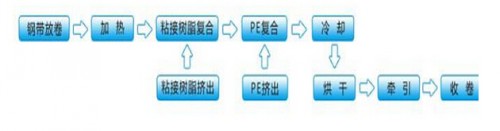 工艺主要步骤:钢带放卷--加热--粘接树脂复合--PE复合--冷却--烘干--牵引--收卷。