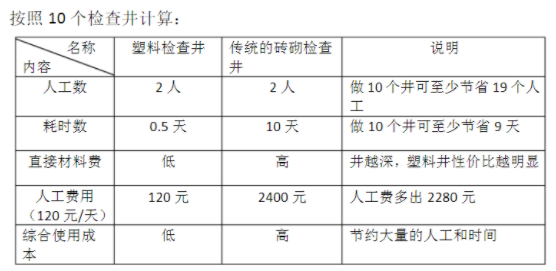 (3) 安全性:塑料检查井:塑料检查井的疏通方式采用清通工具,安全性能好,无*下井疏通,避免作业人员沼气中*。不*井操作,塑料检查井井筒为管材,不存在砖砌检查井砌体砌筑时下井粉刷操作工序。砖砌检查井:需下井疏通,每年都有因作业人员下井疏通引起沼气中*事故,安全性能差。